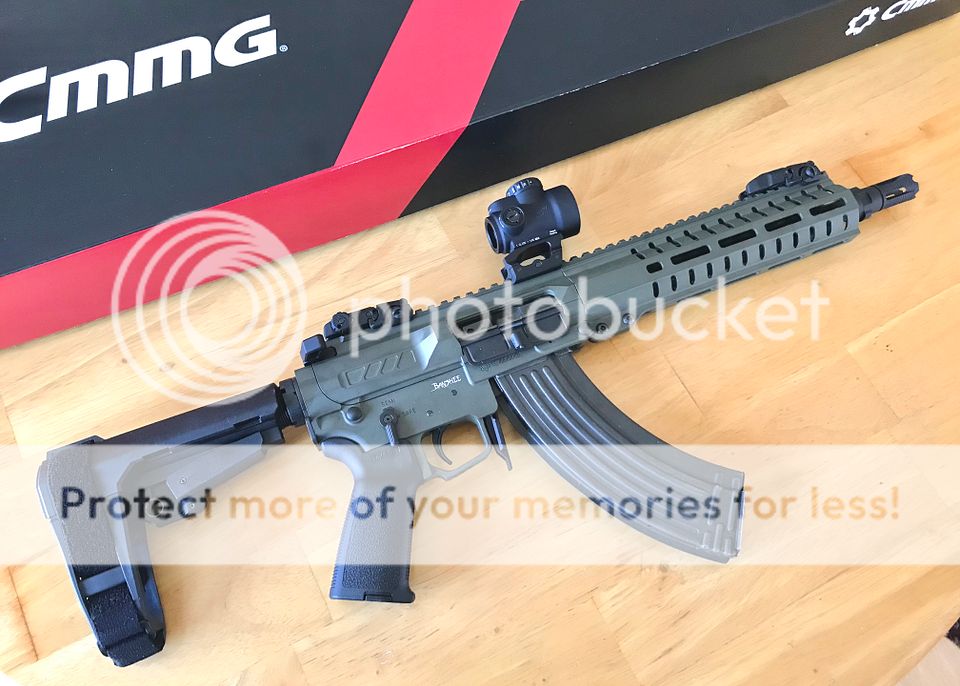 Special order 300 Banshee with change to 10” barrel, handguard and flash hider. The gun looks great in drab green. Pmags lock in tightly while commie metal rattles a little, but no binding like some have reported on early models. The RipBrace is a good feature if you are the only user. But my apeman pal will want full extension so I won’t use the position lock.